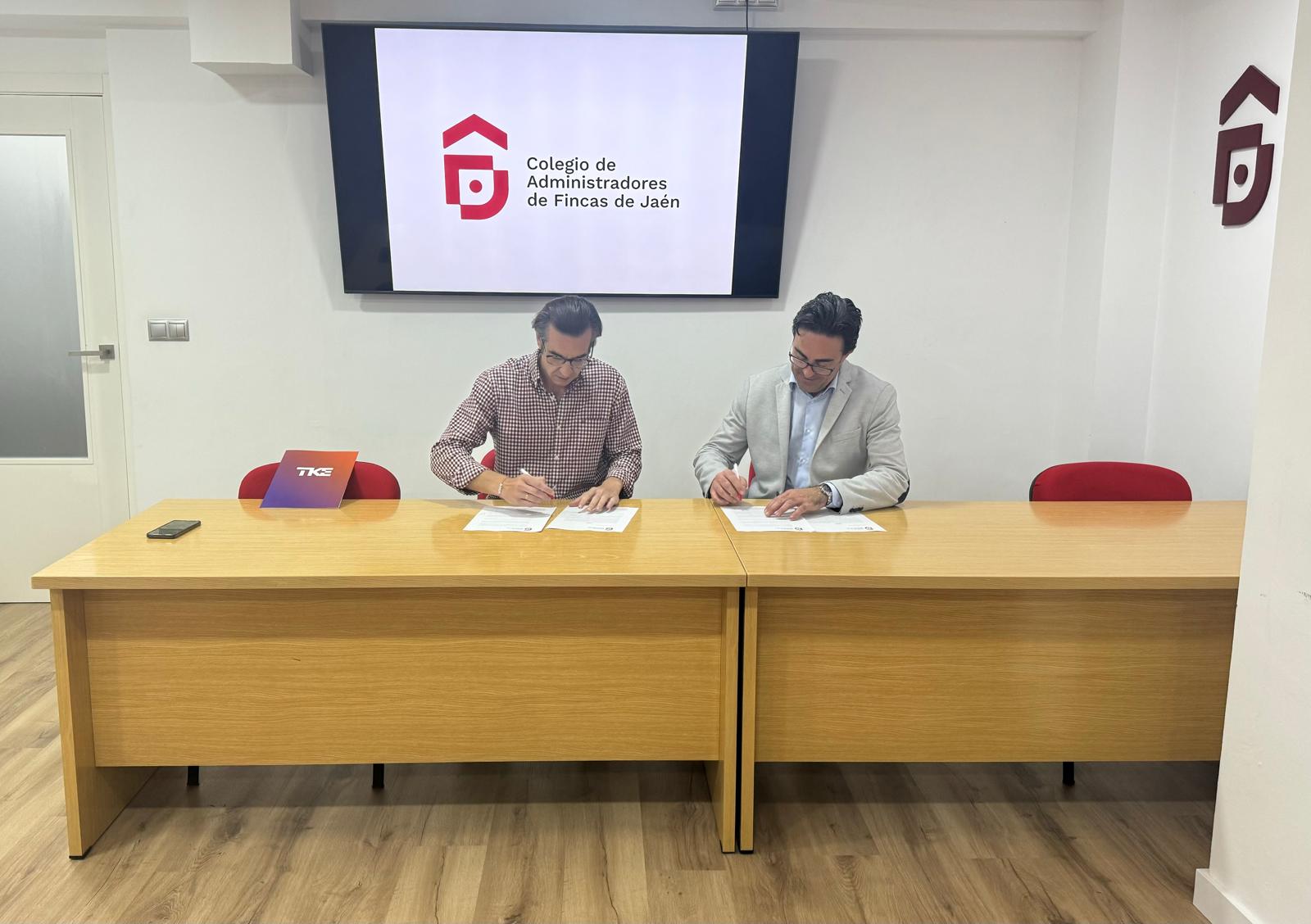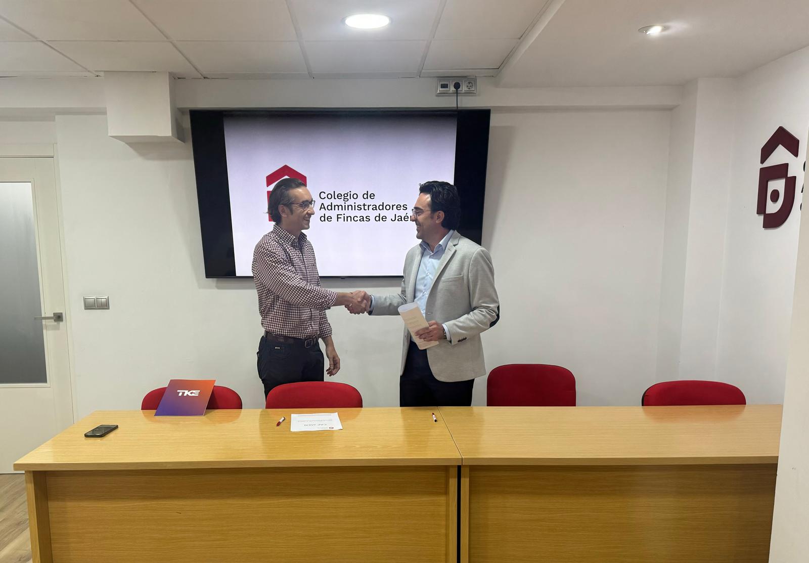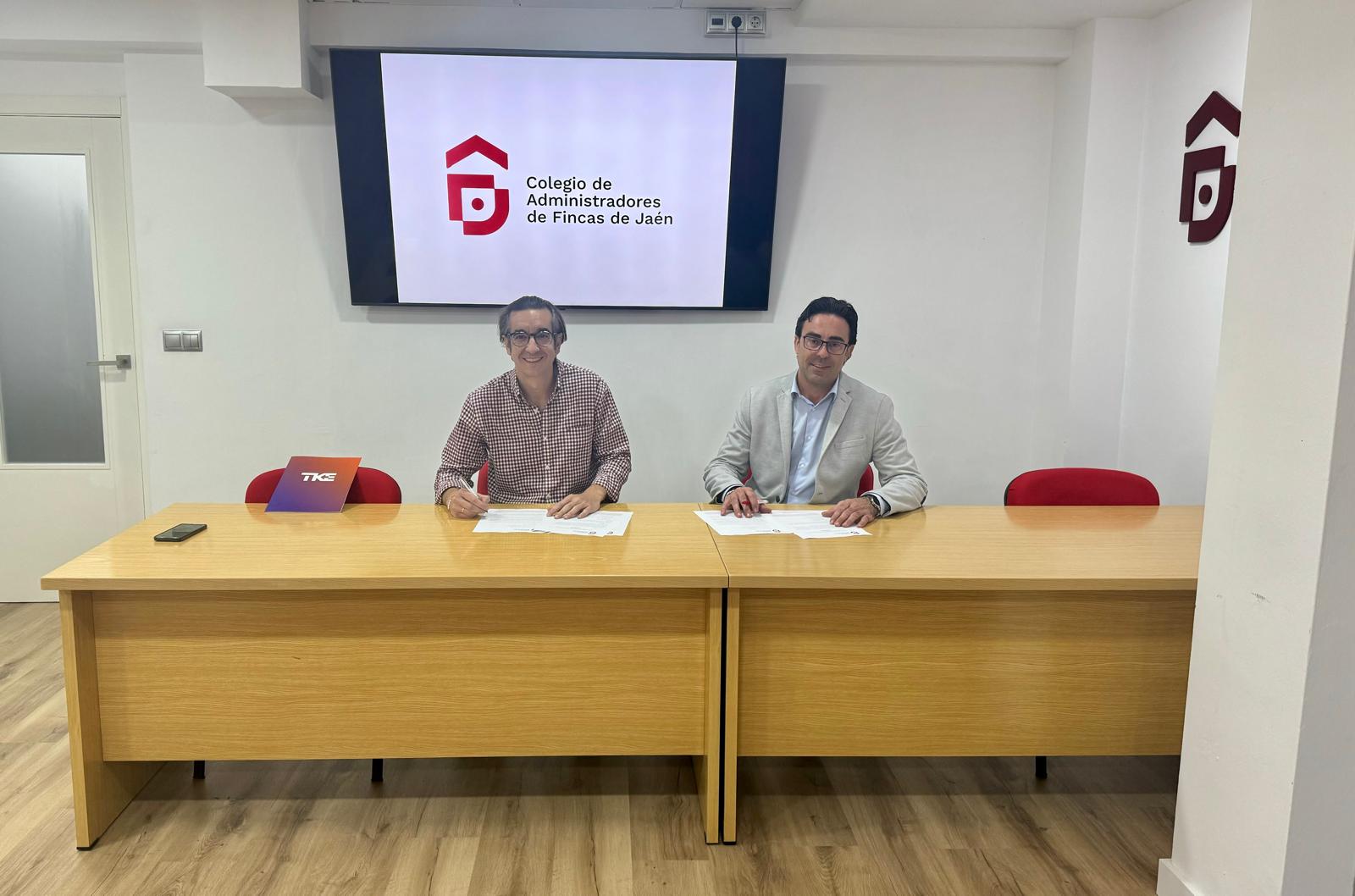 El pasado 13 de mayo, el Colegio de Administradores de Fincas de Jaén firmó un convenio de colaboración con la empresa de ascensores TK ELEVATOR, representada por D. Francisco Javier García Martínez.